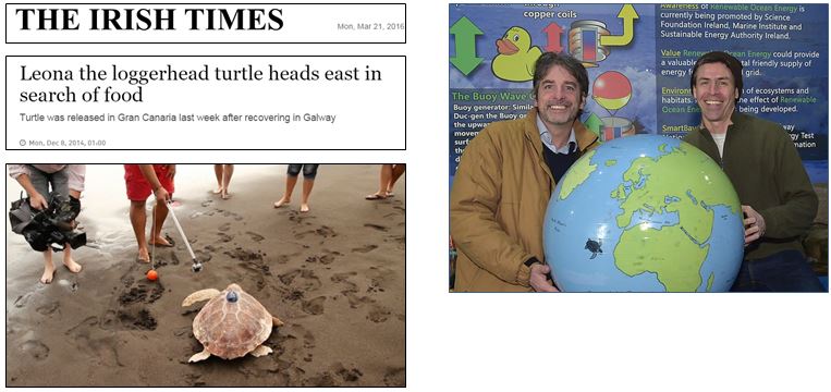Left. MSc student Joanne Casserly accompanied Leona the loggerhead turtle to Gran Canaria which she was releases after she was washed up in Co Clare Ireland in a comatose state. Upon her release there was some apprehension she might be heading back to Ireland but aquarist and student Joanne Casserly said the animal was probably looking for feeding grounds.” “She hasn’t swum north yet – but if she does head northeast, we would hope she would head for the Mediterranean, where there is a turtle colony,” said Ms Casserley. The loggerhead sea turtle, named Leona, has been transmitting her position via her GPS tag since her release on Gran Canaria last Thursday. Right. Dr Eugene Farrell, Geography NUIG & Dr Liam Carr, Whitaker Inst. NUIG at the launch of interactive Renewable Ocean Energy display during National Engineers Week in the Galway Atlantaquaria (Photo: Joe Travers)