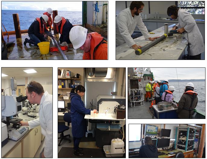 Step 1. Dr Audrey Morley collects offshore sediment cores with the students on the RV Celtic Voyager; Step 2. Jessep Englert and Daithi Maguire prepare core for laboratory analyses; Step 3. Core analysis! MSc student Jake Martin in Plymouth University (UK) working the Fourier transform infrared spectroscopy to analyse the polymer structures of microplastics; MSc student Michelle Curran in Rutgers University (New Jersey, USA) doing geochemical analysis in order to examine past extreme weather events in Ireland. Also in pictures: Daithi Maguire running the geophysical multi-beam system during the cruise.