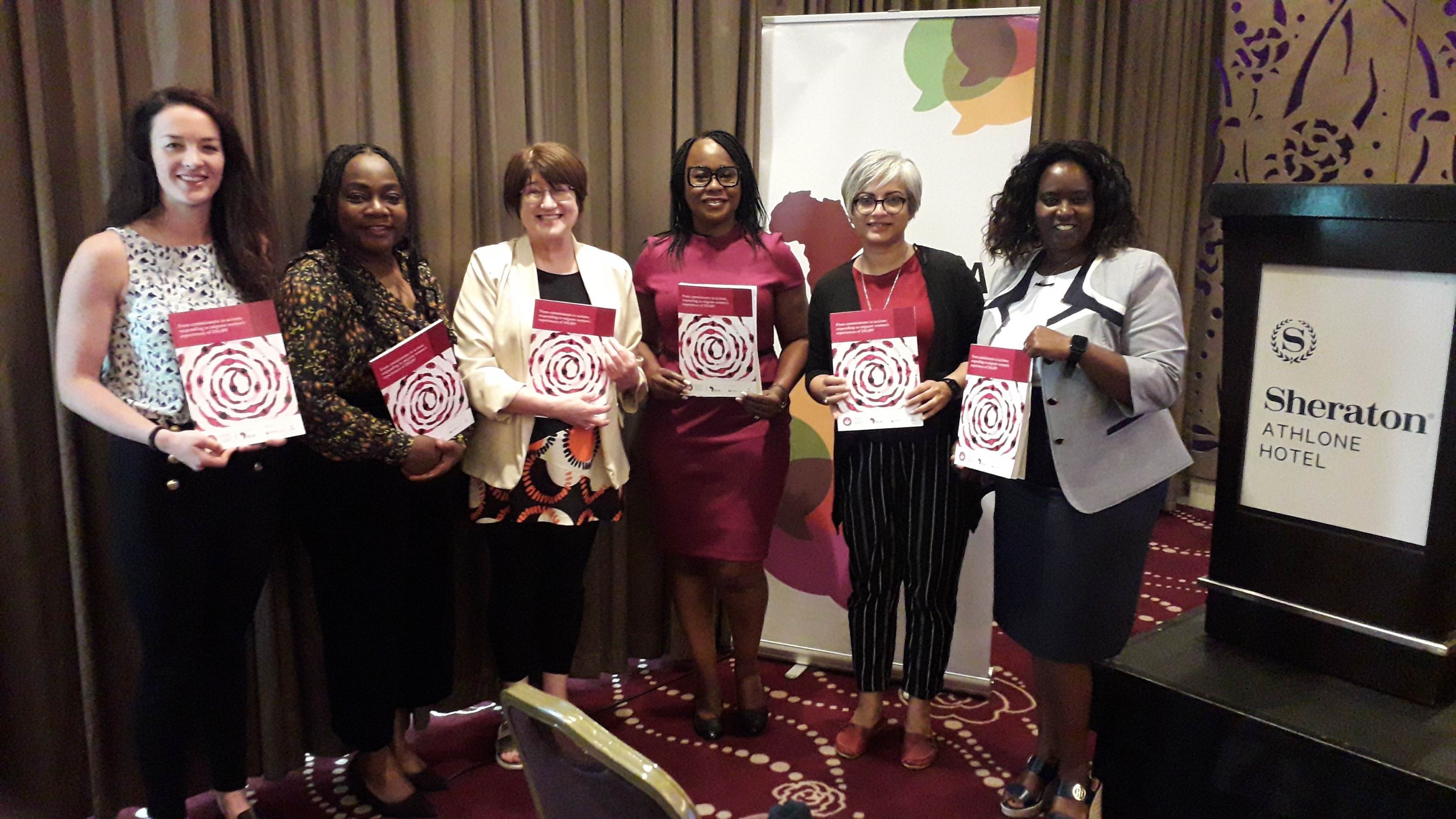 Niamh Cooney, DSGB Coordinator, AkiDwA; Uruemu Adejinmi, Chair of AkiDwA; Prof. Niamh Reilly, Head of School of Political Science and Sociology and PI of GBV-MIG; Helen Uchechukwu Ogbu, doctoral researcher, UNESCO Centre for Child and Family Research; Dr Nasrin Khandoker, GBV-MIG postdoctoral researcher (now with the SALAAM project UL); and Dr Salome Mbugua, CEO AkiDwA.